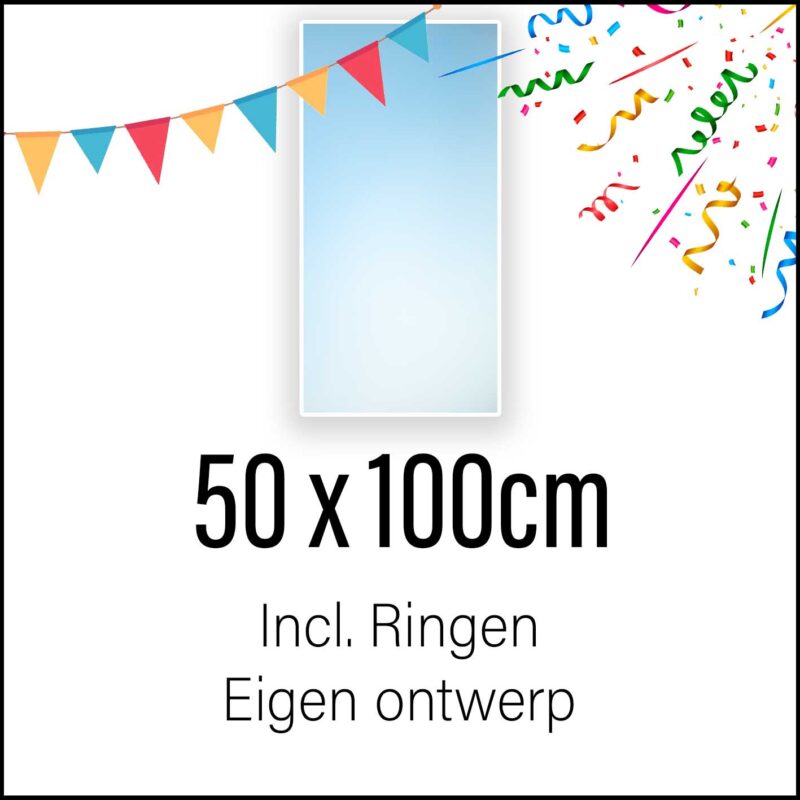 Kies bovenaan voor de knop “spandoek maken“. Vanuit daar kun je het gewenste formaat kiezen en kom je in onze online ontwerptool. In deze ontwerptool kun je kiezen voor de gewenste versieringen, afbeeldingen en tekst om jouw spandoek compleet te maken.